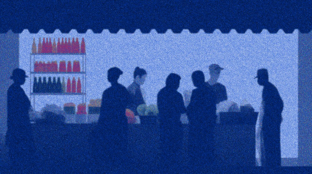 "Grainy blue illustration of people at a farmers market stall with shelved bottles, produce, and a scalloped awning"